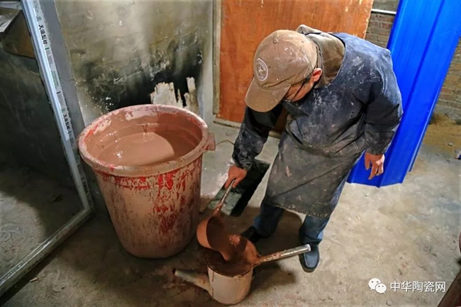 北宋官瓷是為宋代“官、汝、哥、定、鈞”五大名窯之一,創(chuàng)建于我國北宋末年,當時宋徽宗為燒制出符合國儀之用的莊重禮器,引入汝瓷及開封東窯等窯口窯系的制作精華,在今河南開封親自創(chuàng)制的一個青瓷名品。官瓷是我國陶瓷史上第一個由朝廷投資興建的“國有”窯口,也是第一個被皇帝個人壟斷的瓷器種類。圖為人工出漿