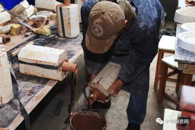 1984年6月,由馮先銘、鄧白等34名古陶瓷專家組成的鑒定委員會認為,開封北宋官瓷研究所用河南當?shù)卦蠠瞥龅墓俅勺髌?ldquo;釉色如玉,風格逼真,可與故宮博物院、上海博物院等收藏的宋官瓷傳世品媲美”。圖為注漿