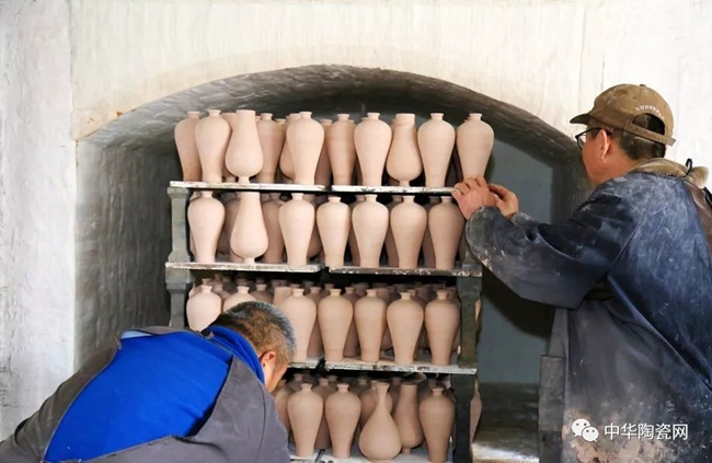 官瓷的釉料,有別于汝瓷等青瓷類的石灰釉,屬于石灰堿釉,在高溫時具有極高的粘稠度,釉水的流動性極小,因此最忌諱浸釉時吸附不實的微小氣泡(孔)存在。一旦入窯燒制,氣泡(孔)不會自行修復(fù),而是形成泡狀,導(dǎo)致瓷器殘損,所以北宋官瓷一直有十窯九不成的說法。因而每次施釉之后,匠人都要認真進行檢查,避免每一個上釉時導(dǎo)致前功盡棄的小氣泡(孔)。圖為入窯素燒