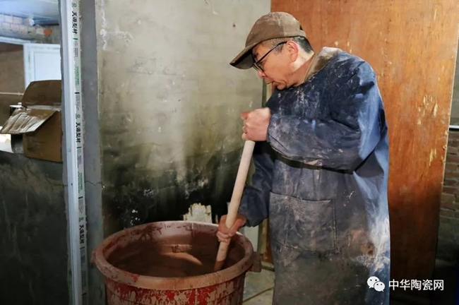 如同平凡的泥土變成珍貴的藝術(shù)品前并不能被人一眼看穿其價值。眼前的于樂土實際上曾歷任開封北宋官瓷研究所的技術(shù)員、研究員、技術(shù)副所長等職,從業(yè)近30年,作為當代北宋官瓷行業(yè)一個深具代表性的人物,他不僅制作出不少官瓷精品,為北宋官瓷贏得了許多榮譽,還首次讓當代官瓷作品選入了國家義務(wù)教育教科書。圖為制作陶漿