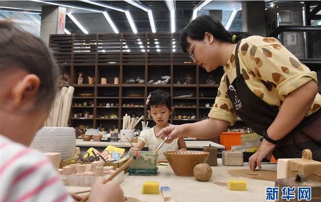 3月31日,工作人員在鶯歌陶瓷博物館陶藝研習室教小朋友捏陶泥。鶯歌古鎮(zhèn)位于臺灣新北市,當?shù)卦O(shè)有陶瓷博物館、陶瓷主題公園和陶瓷老街等,有“臺灣景德鎮(zhèn)”之譽,是感受陶瓷文化的好去處。新華社記者林善傳攝