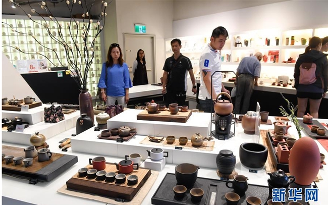3月31日,游客在一家茶具店參觀。鶯歌古鎮(zhèn)位于臺灣新北市,當?shù)卦O(shè)有陶瓷博物館、陶瓷主題公園和陶瓷老街等,有“臺灣景德鎮(zhèn)”之譽,是感受陶瓷文化的好去處。新華社記者林善傳攝