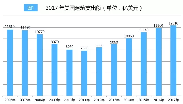 在建筑業(yè)方面,美國2017年建筑支出(包括私有和公有的建筑以及非住宅建筑)創(chuàng)歷史新高,達1.231萬億美元,較2016年增長了3.8%,實現(xiàn)連續(xù)六年的增長。