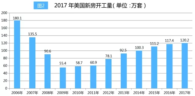 在房地產(chǎn)方面,美國2017年新房開工數(shù)量創(chuàng)下十年來的最高記錄,達120萬套,較2016年增長了2.4%,實現(xiàn)連續(xù)八年的增長見。