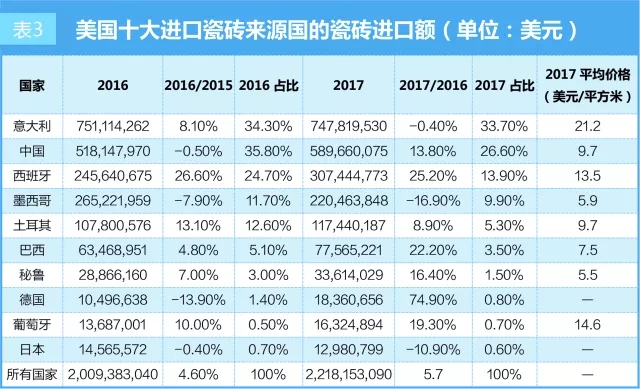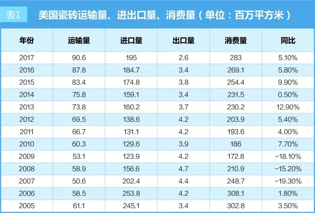 數(shù)據(jù)顯示,2017年,美國瓷磚產(chǎn)量、消費量、進口量繼續(xù)增長。其中,瓷磚產(chǎn)量達創(chuàng)記錄的9600萬平方米,上漲了3.2%;瓷磚消費量達2.83億平方米,增長了5.1%;瓷磚進口量達1.95億平方米,增長了5.6%。值得注意的是,中國仍是美國進口瓷磚第一大來源國,全美消費的超1/5的瓷磚來源于中國。