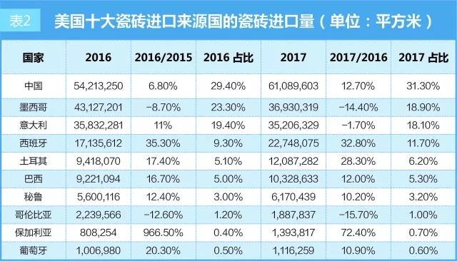 2017年,中國再次成為美國第一大進口瓷磚來源國。事實上,從2015年起,中國就替代墨西哥成為對美出口瓷磚量最多的國家。2017年中國對美國出口的瓷磚量從2016年的5400萬平方米增長到6100萬平方米。增長了12.7%,占美國進口瓷磚總量的31.3%,高于2016年的29.4%。