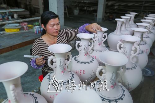 桃源鎮(zhèn)昌隆陶瓷廠的工人正在薄坯花瓶上作畫。 (吳騰江 攝)
