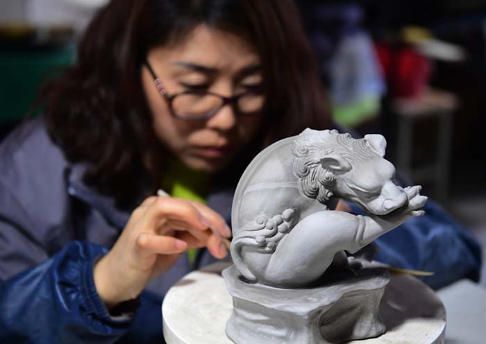 2月26日,在位于耀瓷小鎮(zhèn)的銅川市觀唐陶瓷有限公司的工作室內(nèi),工作人員李俠在一只“獅子”身上擦水,去除瑕疵! ⌒氯A社記者邵瑞 攝