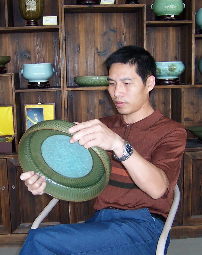 葉小春出身青瓷世家,一直跟隨祖輩,以制作青瓷為生,配制胎、釉水配方是他的特長,曾成功研制出梅子青、粉青、流彩釉、烏釉金滴、凝翠釉等多種胎釉。2001年,他還破解了失傳近千年的哥窯珍品冰裂紋的“密碼”,并獲國家發(fā)明專利,成為龍泉青瓷史上獲得國家創(chuàng)造發(fā)明專利第一人。