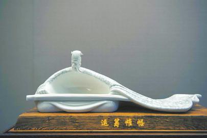記者在展廳看到,相比傳統(tǒng)的佛教造像,用現(xiàn)代學(xué)院派手法制作的瓷雕,顯然更受年輕人喜愛(ài)。陶瓷藝術(shù)大師蘇獻(xiàn)忠的《進(jìn)出》仕女系列白瓷工藝品,既有傳統(tǒng)德化白瓷的溫潤(rùn)質(zhì)地,又有現(xiàn)代雕塑洗練的線條和審美;另一件創(chuàng)新白瓷《運(yùn)籌帷幄》造型夸張,正在彈琴的諸葛亮身體鑿空,寓意“空城計(jì)”,設(shè)計(jì)手法十分高妙。