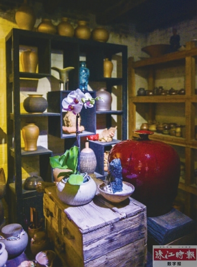 因?yàn)閻酆炔,劉和平運(yùn)用拉坯技術(shù)主攻茶器、花器、香器的制作。在他的工作室,擺滿了陶制茶壺、茶杯、茶倉(cāng)等,甚至還有一個(gè)陶制炭爐。采訪當(dāng)天,他的朋友孫先軍正在一旁為記者烹煮茶水。劉和平說,相比瓷器,陶制茶杯不顯湯色,難以清洗,難以像瓷那樣還原茶的真味,但是陶器也自有素雅古樸風(fēng)格,吸引了喜歡這種風(fēng)格的茶友。