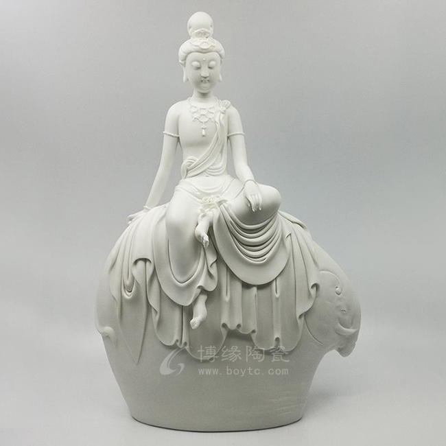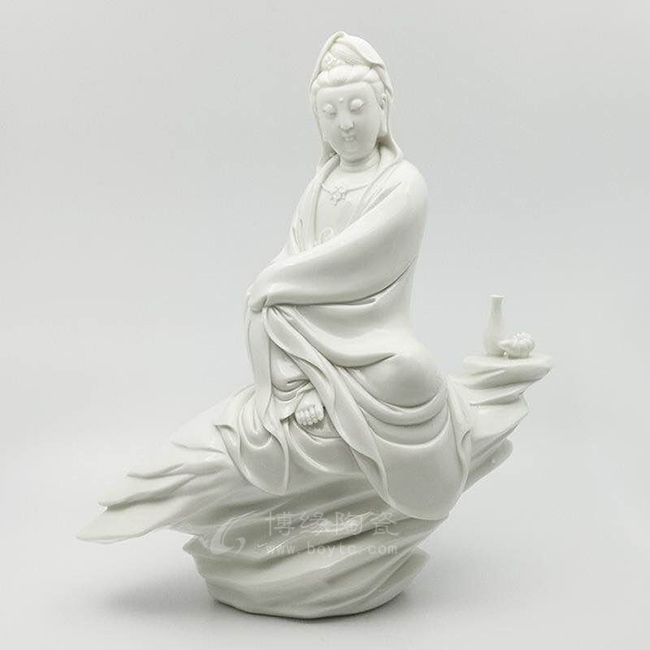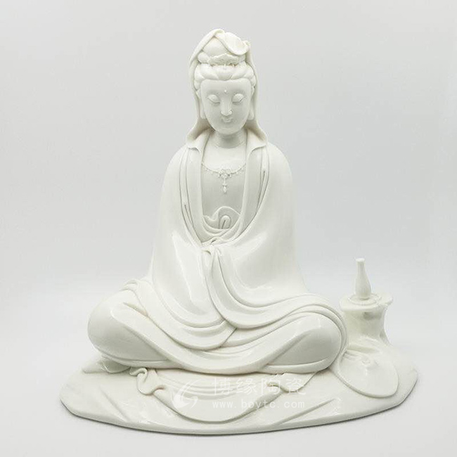 德化白瓷所塑佛像有性格鮮明、造型優(yōu)美、神態(tài)逼真、風(fēng)格洗練的特點(diǎn)。有一種單純的雕塑美和原材料的質(zhì)地美,最能體現(xiàn)佛教樸素、平和的思想。早在明代德化白瓷佛像就名聲在外,一代“瓷圣”何朝宗佛像名作流傳后世,成為世界各大博物館收藏的珍品,更對(duì)佛像雕塑史上產(chǎn)生深遠(yuǎn)的影響,形成“何派”雕塑,其開(kāi)創(chuàng)的捏、塑、雕、刻、刮、削、接、貼八字技法延用至今。何派觀音雕塑注重于細(xì)節(jié)之美,精益求精,故而十分著意衣紋的刻畫,使線條流暢,翻轉(zhuǎn)自然。觀其佛像,仿佛有春風(fēng)拂面,衣袂飄揚(yáng)的出塵之感。