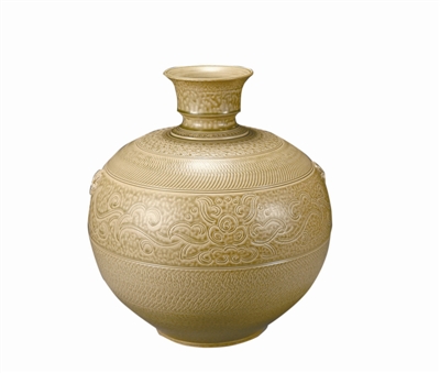 婺窯灰釉刻寶相花天球瓶