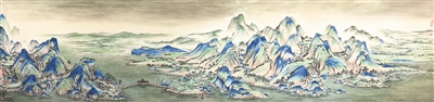 日前,筆者在南昌美術(shù)館展出的“李潤(rùn)素胎仿古青綠山水瓷板畫作品展”中見到了“瓷本”《千里江山圖》。按照絹本原作同比例復(fù)制,高51.5厘米,原作長(zhǎng)1191.5厘米,“瓷本”則分成了6塊,每塊長(zhǎng)約200厘米。絹本原作山石先以墨色勾皴,后施青綠重彩,用石青石綠烘染山巒頂部,山峰起伏、江河浩渺,漁村野市間于其中,青山為點(diǎn),湖泊為面,舟橋?yàn)榫,咫尺百里,高遠(yuǎn)平遠(yuǎn)深遠(yuǎn),顯示青山疊翠。這6塊“瓷本”《千里江山圖》較好地將原作復(fù)原,拼在一起,氣勢(shì)壯觀。