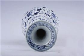 這件玉壺春瓶身上的纏枝花卉,以荷花瓣、蕉葉、下垂如意云紋等組成,均是元代青花中較為流行的裝飾紋樣,說明此瓶應為元代成熟期的代表,屬景德鎮(zhèn)窯口的產品。由于山東地區(qū)發(fā)現(xiàn)元青花頗為少見,而這件玉壺春瓶瓶口內的卷枝紋后世也很少效仿制作,故而十分珍貴。