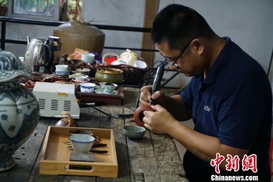 不大的工作室里,有陳建國收藏的紫砂壺,也有客人讓其修復的物件。記者了解到,這是一間基本不對外營業(yè)的工作室,他接的活兒都是經朋友口口相傳介紹的。