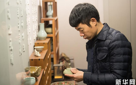 1月16日,陳衛(wèi)武在“宋韻”展廳查看一件龍泉窯古器物。他收藏了一些古器物和殘片,作為創(chuàng)作的參照。 青瓷藝人陳衛(wèi)武,1973年生于浙江龍泉,一家三代均為國營瓷廠工人。瓷廠改制后,他難舍對青瓷的熱愛,前往更為古老的青瓷故鄉(xiāng)慈溪,對越窯青瓷進(jìn)行了6年的研習(xí)。 2007年,陳衛(wèi)武重回龍泉,成立“宋韻”工作室,創(chuàng)作沿襲青瓷脈絡(luò)、符合當(dāng)代審美的文房、茶、花器具,作品獲得越來越多人的推崇。 “要走在前面,做出人家沒有的東西,得保持心里的簡單和敏感。”陳衛(wèi)武說。