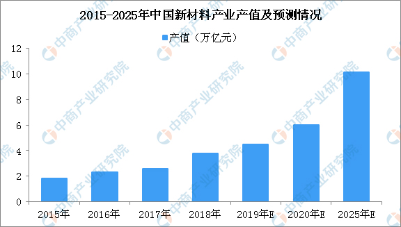 新材料作為國民經(jīng)濟(jì)先導(dǎo)性產(chǎn)業(yè)和高端制造及國防工業(yè)等的關(guān)鍵保障,是各國戰(zhàn)略競爭的焦點。我國新材料產(chǎn)業(yè)的戰(zhàn)略地位不斷提升,目前已上升到國家戰(zhàn)略層面。目前我國新材料產(chǎn)業(yè)發(fā)展勢頭良好,在產(chǎn)業(yè)政策的促進(jìn)下,將保持這良好的增長勢頭,預(yù)計到2025年新材料產(chǎn)業(yè)總產(chǎn)值將達(dá)到10萬億元,其市場前景十分廣闊。