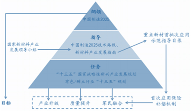 我國高度重視新材料產(chǎn)業(yè)發(fā)展,目前通過綱領(lǐng)性文件、指導(dǎo)性文件、規(guī)劃發(fā)展目標(biāo)與任務(wù)等構(gòu)筑起新材料發(fā)展政策金字塔,予以全產(chǎn)業(yè)鏈、全方位的指導(dǎo)。其中綱領(lǐng)文件主要為《中國制造2025》,指導(dǎo)性文件包括《中國制造2025》重點領(lǐng)域技術(shù)路線圖、《新材料產(chǎn)業(yè)發(fā)展指南》,發(fā)展任務(wù)與目標(biāo)相關(guān)文件包括《“十三五”國家戰(zhàn)略性新興產(chǎn)業(yè)發(fā)展規(guī)劃》、《有色金屬行業(yè)發(fā)展規(guī)劃(2016-2020年)》、《稀土行業(yè)發(fā)展規(guī)劃(2016-2020年)》等。