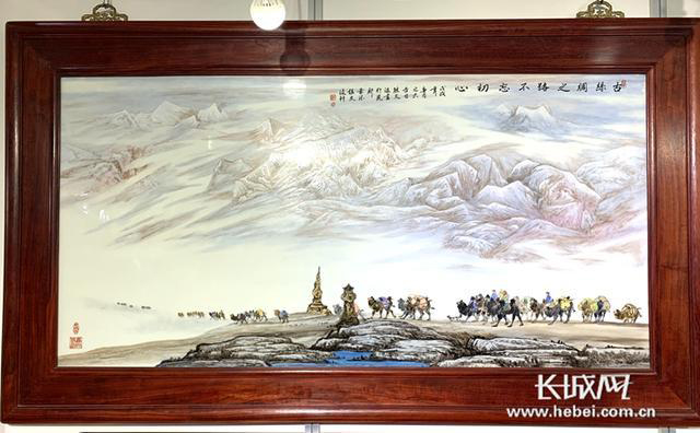 景德鎮(zhèn)高級(jí)工藝美術(shù)師熊文波創(chuàng)作的瓷雕純手工原創(chuàng)作品《古絲綢之路——不忘初心》。長(zhǎng)城新媒體記者 張藝萌 攝
