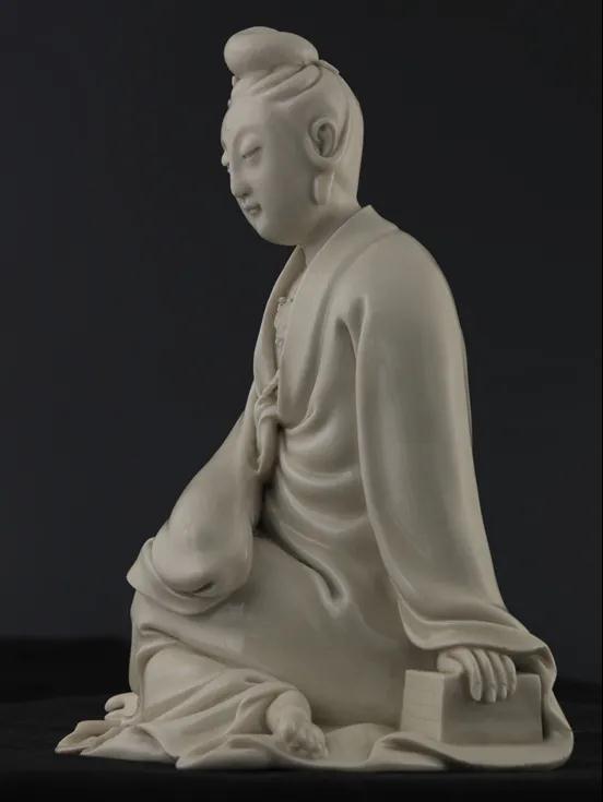 何朝宗又名何來,是明代嘉靖萬歷年間的著名雕塑家,擅長木雕、塑雕,尤其精于后者。他的瓷塑作品,吸收泥塑、木雕和石刻造像的各種技法,結(jié)合瓷土特性,博取各家之長,形成獨具一格的“何派”藝術(shù)。他所塑造的各種古佛神仙,發(fā)揮傳統(tǒng)雕塑“傳神寫意”的長處,微妙地表現(xiàn)人物的內(nèi)心世界,富有神韻。在注意人物內(nèi)在表現(xiàn)的同時,著意外表的衣紋刻畫,線條清晰、簡潔、柔媚流暢,翻轉(zhuǎn)自然,圓勁有力。何氏塑造的觀音像以世俗女子形象為藍(lán)本進(jìn)行藝術(shù)加工,無論是整體的塑造,還是眼神、面部肌肉、手指的細(xì)部刻畫,都一絲不茍,準(zhǔn)確生動。