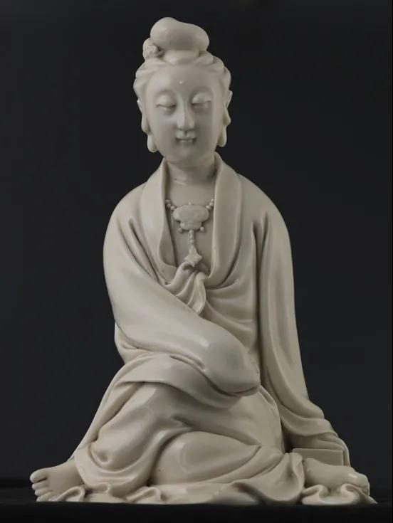 觀音舒坐  神態(tài)肅穆。何朝宗款的白釉觀音,高20.9厘米、底寬15厘米,通體白釉,觀音舒坐,發(fā)髻高聳,眼簾下垂,身著羊腸裙。神態(tài)肅穆,衣紋簡練灑脫。
