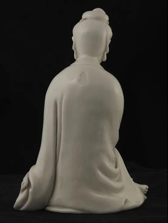 葫蘆形“何朝宗”款,塑像背面有一陰文葫蘆形“何朝宗”款。堅細(xì)的胎質(zhì)配以瑩潤的白釉,觀音愈發(fā)顯得如脂似玉、典雅可愛,令人嘆為觀止。