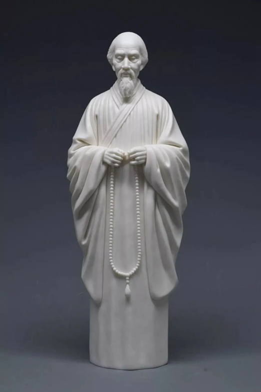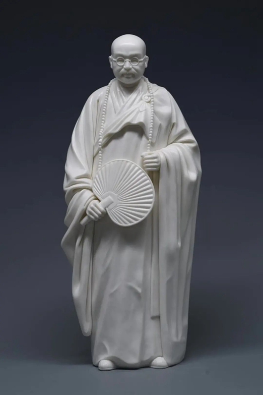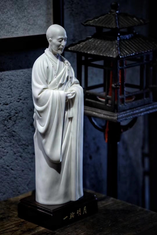 在此,弘一法師題材的陶瓷藝術品排滿壁柜,或坐或站,每一尊雕像都透出弘一法師獨特的慈悲神情。