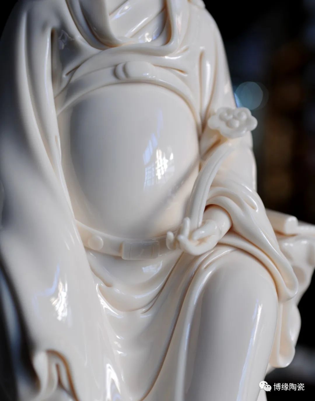 早在明代德化白瓷佛像就名聲在外,一代“瓷圣”何朝宗佛像名作流傳后世,成為世界各大博物館收藏的珍品,更對佛像雕塑史上產(chǎn)生深遠的影響,形成“何派”雕塑,其開創(chuàng)的捏、塑、雕、刻、刮、削、接、貼八字技法延用至今。何派觀音雕塑注重于細節(jié)之美,精益求精,故而十分著意衣紋的刻畫,使線條流暢,翻轉(zhuǎn)自然。觀其佛像,仿佛有春風(fēng)拂面,衣袂飄揚的出塵之感!