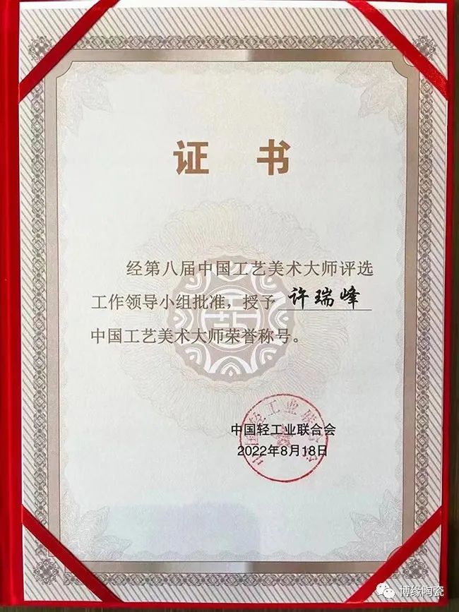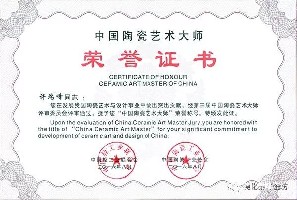 作品配有中國工藝美術(shù)大師許瑞峰收藏證書及榮譽(yù)證書