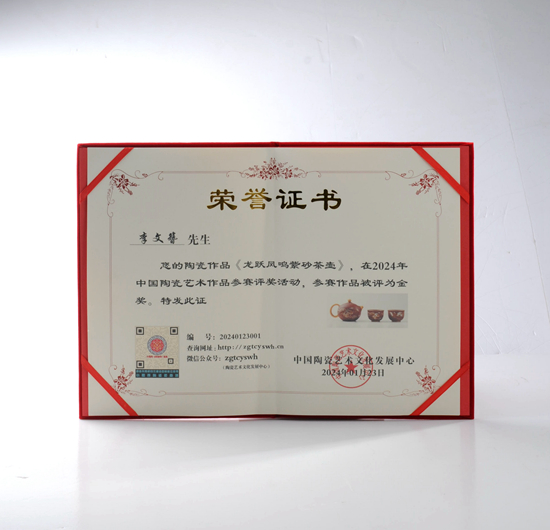 2024年作品《龍躍鳳鳴紫砂茶壺》榮獲北京中國陶瓷藝術(shù)名家作品展金獎