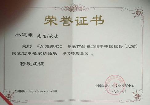 中國(guó)國(guó)際<北京>陶瓷藝術(shù)名家精品展<如意彌勒>金獎(jiǎng)。2016年經(jīng)中國(guó)陶瓷藝術(shù)文化發(fā)展中心評(píng)審委員會(huì)評(píng)定為“中國(guó)陶瓷藝術(shù)家”。