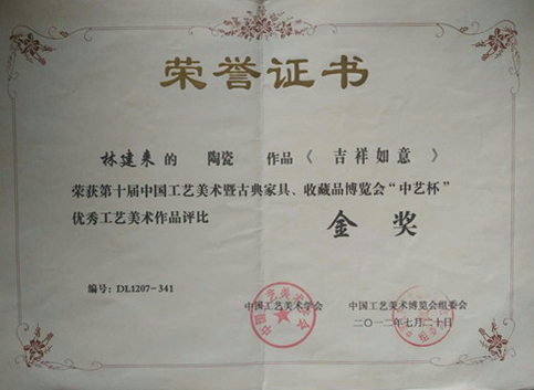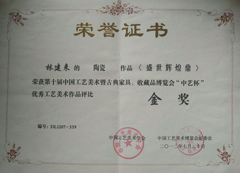 2007年7月作品《吉祥如意》榮獲中國(guó)工藝美術(shù)古典家具金獎(jiǎng)。2012年7月作品《盛世煌鼎》榮獲中國(guó)工藝美術(shù)古典家具金獎(jiǎng)。