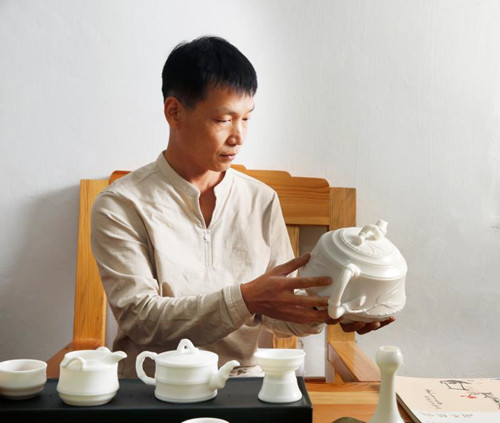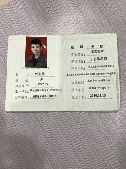曾憲鋒 ,國家一級/高級技師 、工藝美術(shù)師 、中國陶瓷藝術(shù)名家 、閩派雕刻藝術(shù)大師 、福建省雕刻藝術(shù)家協(xié)會理事、富盈藝術(shù)總監(jiān)、德化縣巖鈺陶瓷研究所所長。他1989就讀于福建省德化縣陶瓷職校,畢業(yè)后先后在德化三廠擔(dān)任陶瓷藝術(shù)設(shè)計和原礦采購。2013年在景德鎮(zhèn)陶瓷學(xué)院雕塑藝術(shù)設(shè)計專業(yè)深造并畢業(yè),在從事陶瓷雕塑設(shè)計創(chuàng)作27年來,其作品:((多籽南瓜壺))參加第三屆海峽兩岸雕刻藝術(shù)大賽臺灣賽區(qū),榮獲“福雕獎”金獎,并被臺灣國立屏東大學(xué)收藏,作品((荷塘月色))被收藏于海峽民間藝術(shù)館,作品((梅樁壺))在2017中國國際(北京)陶瓷藝術(shù)名家精品展被評為特別金獎等等。他孜孜求索德化白瓷巖脂窯之返瓷的制作工藝,大膽打破德化白瓷傳統(tǒng)燒制方法,采用純天然上等巖礦石配方,在不施加任何釉水下,燒制出別樣的返瓷藝術(shù),為德化白瓷在開新的篇章。
