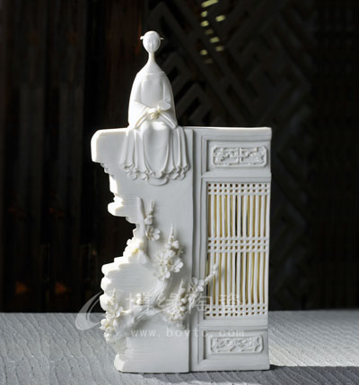【產(chǎn)品名稱】:梅影橫窗瘦 【產(chǎn)品瓷質(zhì)】:白瓷 【產(chǎn)品分類】:人物瓷塑 【產(chǎn)品件數(shù)】:1件 【產(chǎn)品釉色】:白釉 【產(chǎn)品花面】:純白無花面 【推薦等級(jí)】:★★★★★ 【原 產(chǎn) 地】:福建德化 【上市年份】:2014 【產(chǎn)品包裝】:錦盒 【規(guī)格說明】:長寬高:20*7*38(cm) 【產(chǎn)品工藝】:高級(jí)象牙白瓷泥1300以上高溫?zé)?br /> 【產(chǎn)品簡介】:《梅影橫窗瘦》以德化特有的溫潤如玉的“中國白”為胎質(zhì),純手工制作,所塑人物性格鮮明,造型優(yōu)美,神態(tài)逼真,風(fēng)格洗練。