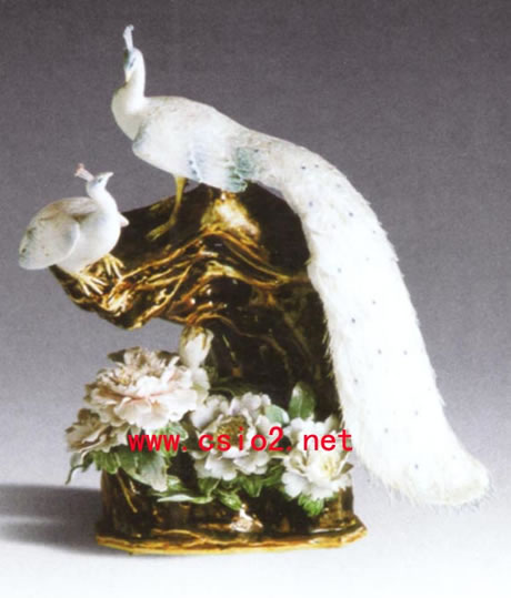 這件精美絕倫的作品集中了作者幾十年的全部經(jīng)驗(yàn)和智慧,充分展示了高超的技藝?兹甘敲赖幕恚蠲赖氖怯鹈。作者結(jié)合圓雕的孔雀,把最擅長的捏雕技法施展開來。經(jīng)過多次試驗(yàn),把細(xì)如發(fā)絲的羽毛一根一根捏上去,終于獲得了成功。羽毛細(xì)而不亂,具有很強(qiáng)的整體感。石頭是以烏金釉為主的多種顏色釉,襯托出白色的孔雀和牡丹花;^是釉下裝飾的,再現(xiàn)嬌艷的自然本色,展示出獨(dú)特的風(fēng)采。