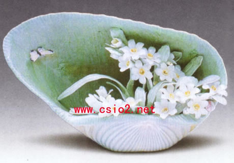 捏雕作品如此精巧工細,往往不便保護與攜帶,作者機敏地想到了美麗的貝殼,利用它的自然形體作為盛美水仙的器皿,既有合理性,又十分好看。既可以起到保護小巧纖細的捏雕花卉的作用,又可以很穩(wěn)定的陳設,實在是太巧妙了。作者以嫻熟的技藝,借助于色釉、色泥等陶瓷材質,捏塑出清新秀美的水仙花,款款大方,穿插自然,色彩素潔高雅,放上一只蝴蝶,平添無限情趣,給人一種賞心悅目的美的享受。