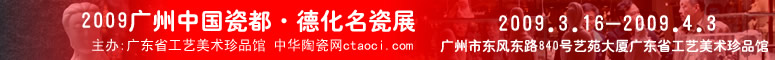 3月16日,2009廣州中國瓷都德化名家名瓷精品展,正式開幕,地處廣州市東風(fēng)東路840號藝苑大廈省工藝美術(shù)珍品館。此次展覽將持續(xù)到4月3日,系由廣東省工藝美術(shù)珍寶館與中華陶瓷網(wǎng)聯(lián)合舉辦。 來自20多位省級、國家級工藝美術(shù)大師的200多件德化名家精品瓷精彩亮相,一展德化陶瓷風(fēng)采。 ...[更多簡介] |